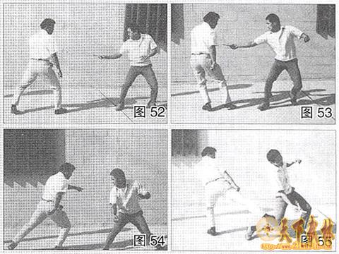 (图52~图53)你与一持刀歹徒刘峙,当他挥刀来刺时,你迅速后退躲开。(图54~图55)在刀划过的瞬间,你立刻向前侧踢歹徒的膝弯处,使他跌倒在地。