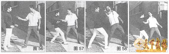 (图56)歹徒持枪对着李小龙。(图57)李小龙迅速向前反抗,在扭转臀部的同时突然抓住歹徒的手腕,使自己处于火力之外。(图58~图59)继而用自由的手攻击歹徒咽喉使他的手臂滑落下来,然后用左后拳攻击他。
