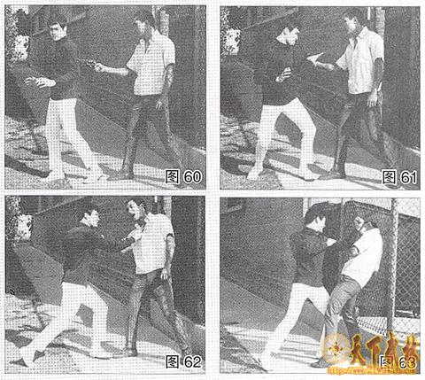 (图60)歹徒拿枪对准李小龙背部。(图61)李小龙逆时针方向转身用胳膊避开歹徒的手,使自己处于火力之外。(图62,图63)然后他一手擒拿住歹徒的手腕,一手攻击他的咽喉。随后重力打击歹徒的头部。