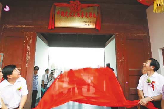 国家体育总局副局长冯建中(右)、国家体育总局武术运动管理中心党委书记何青龙(左)等领导为“中国武术太极拳发源地”揭牌。 记者 赵耀东 摄