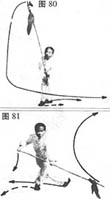 背步扫枪:两手持枪向右降落后,再向前、向左横扫;同时,左脚向左移一步,右脚亦向左移,置于左脚后边,脚尖点地(图81)。