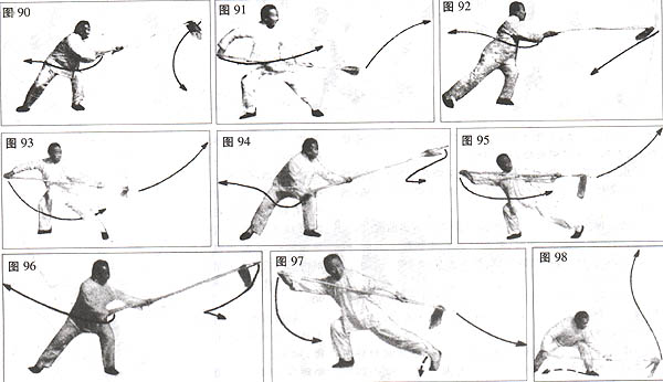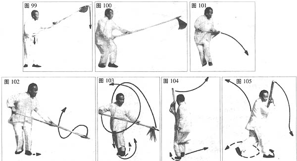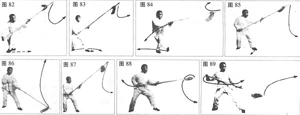 扯钻缠摆:重心移至右腿,上体微向后撤;同时,左把不动;右把随上体之后撤,向右后方扯开,使枪尖割一弧线(图89)。