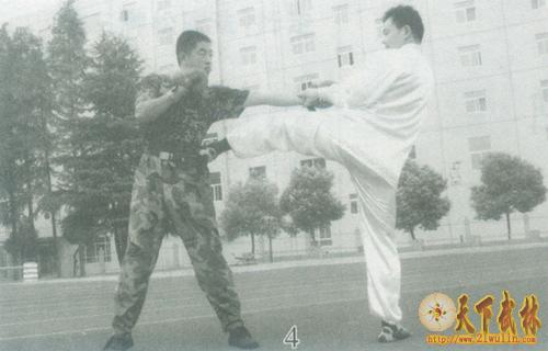 2,上动不停,对手右拳一击不中,又发左拳,这时我重心移于左腿,右臂拨开来拳,左臂顺势采劲砍击对手脖颈动脉(图2)。如对手格挡,我则起右腿抽击对手左肋部(图3);如对手闪避,我则重心右移起左鞭腿抽击对手左肋或踹击胸腹部(图4)。