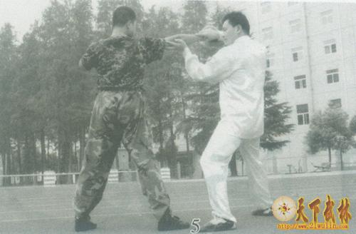 [练习要点]本势动作主要练习自身左突右闪的整体协调能力。我本人在学习之始,也有老师讲此动作是叼托手。即对手用右拳向我进攻时我左手叼抓对手手腕,左手上托其肘(图5)。在经过多次反复练习后,这作动作做得都不成功。试想:在双方快速的击打对抗中,要想击中对手一拳或一腿都很困难,更何况是要抓住对方快速运动中的手腕. 3,当我左鞭腿或踹腿被对手格挡或闪避开时,我左腿迅速前落,左掌快速前弹以掌指撩其面或插其眼、喉等部位(图6):待对手上防我左掌时,我右脚快速向前跟进,同时右掌掌指插击对手小腹或撩击其裆部(图7)。