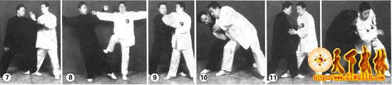 当乙方出左腿,双手推按甲方右臂时,甲方重心后移,含胸塌腰,将乙方引化到身,左手搭在乙方右肘外侧。待机用扌列劲摔倒乙方(图11)。