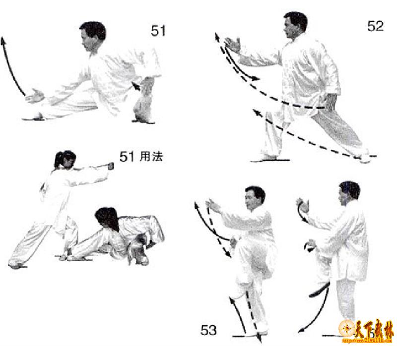 上体稍向左转再向右转。左腿屈膝下蹲;右腿屈膝提起,右脚贴着地面向右侧伸出,脚尖向 内扣,全脚掌着地,右腿伸直,成右仆步。同时两手随转体向左、向下弧形运行,右手经身体前方并沿着右腿内侧向右前方穿出至右脚上方,拇指侧向上;左臂屈 肘,左手按于左膝外侧,手指斜向前方,手心斜向下。目视右手(图51)。