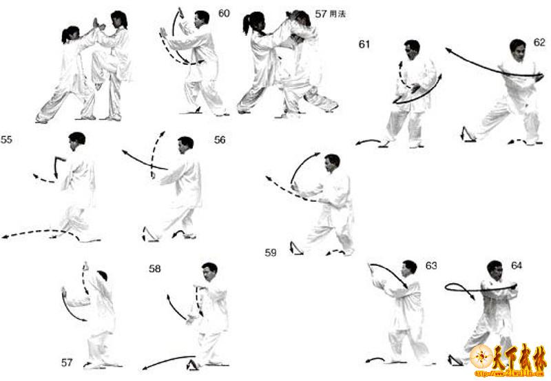 3?郾上体向右转靠,身体重心慢慢向右腿移动。右脚全脚掌落地,随之左脚提起向右脚跟进半步,脚前掌先着地,然后全脚掌落地踏实。同时右手臂随转体向右斜上方运行,手心向上,高与眼眉平;左手按于右肘内侧,手心向下。目视右手(图63)。