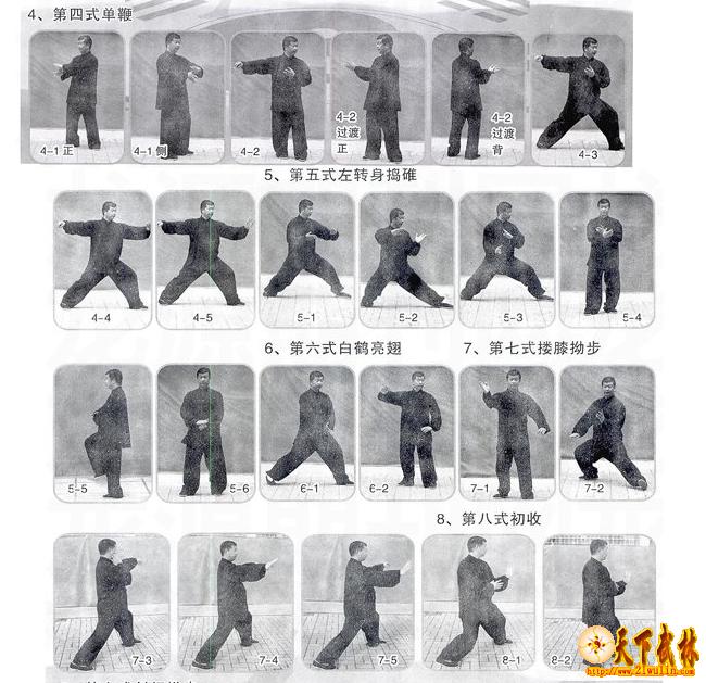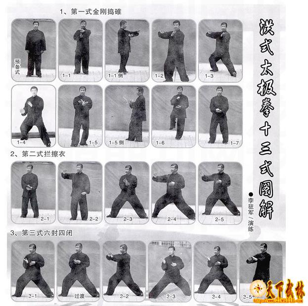 原文:十三总势莫轻视,命意源头在腰膝。变转虚实须留意,气遍身躯不少痴。 腰是轴,须旋转;膝是活塞,调节轮子转的方向;裆部一松,则膝上升;裆部一紧,则膝下沉,重心永远平衡。这就是变转虚实的方法。得法,则周身是圆的,没有障碍之处,就不会少滞。 原文:静中独动动尤静,因敌变化是神奇。势势存心揆(kui)用意,得来不觉费功夫。 彼动我随,是“静中触动”,动的圆,所以“虽动犹静”,全是因对方来劲而变化。他的方向变化大小、时间、快慢,我不但随着变化,而且争取主动,比他占先一步。看似神奇,实系一定规律,妙处全在于“熟”字。平时练拳每式要揣思它的道理、作用,日久自然得悟其妙。 原文:刻刻留心在腰间,腹内松净气腾然。尾闾中正神贯顸,满身轻利顶头悬。 头两句是说中盘内气,注意腰间旋转时,腹中能松而静,则内气旺盛舒畅。后二句是说外形,下盘要求尾闾中正。尾闾,俗名尾骨,即长强穴,要做到 中正,须略使向后上翻,如上身端坐时状态。尾骨上翻,则前边小腹斜向后合,而气舒松,精神直通到头顶,这是和下盘的联系。上盘则百会穴如同悬上一绳,把全 身提起来,所以满身轻利。 原文:仔细留心向推求,屈伸开合听自由。入门引路须口授,工夫无息法自修。 练拳时一些小动作,也要留心仔细推求原理。应当怎么做,怎么屈伸开合,这里说“听自由”不可误解,不是随便的自由屈伸开合,而是按照原理规 律,很自然的动作。所以又说“入门引路须口授”,不但要求明师的讲道理,并且要正确示范,然后根据所学的仔细推求,长期锻炼,则于拳法自然修进。这是学拳 的程序,说明入门不经人讲明道理不行,不自己仔细揣摩不行,不下工夫练也是不行。因此,我学到的规律是,多听(听道理)、多看(看示范动作)、多想(揣摩 道理和示范动作)、多练(照理照样的练)。 原文:若言体用何为准?意气君来骨肉臣。想推用意终何在?益寿延年不老春。 体是动作的形式,用是作用。不拘形式和作用,全是以合理的意气为主。最后的结果,是为了益寿延年,劳动生产。 原文:歌兮歌兮百四十,字字真切已无遗。若不向此推求去,枉费工夫贻叹惜。 这是说,讲的道理字字真实切要,已无保留,全在学者照此推求锻炼。如不用心推求,而盲目的练,等于白费了工夫,所以实践必须结合理论。