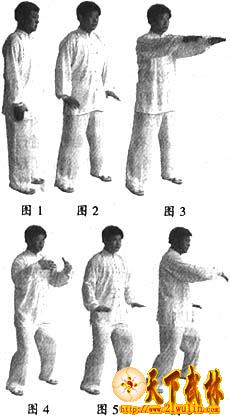 ②身体重心微右移,提左足侧开步,略比肩宽,脚尖着地,渐踩实足跟,重心随踩劲移至两足间。身体正直,即两乳头约与小腹面竖直平齐。