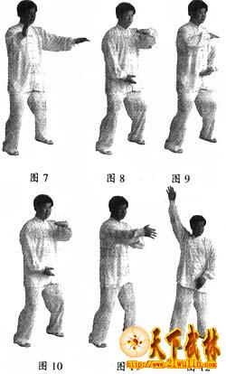 ①腰胯右旋拉,疾速引劲向左催动,从右腰胯至左腰胯上升至左肩胸至右肩胸。胸、腹、背、腰、胯整体联动,划一立圆,同时,右掌随动外旋前抄,如扶球之上弧线,左掌在下外旋随转,如托球之下弧线。两掌心抱球不停转至左掌在上扶,右掌在下托,抱球中定,气落丹田。转圆时,双足随劲变换虚实(图6、7、8)。