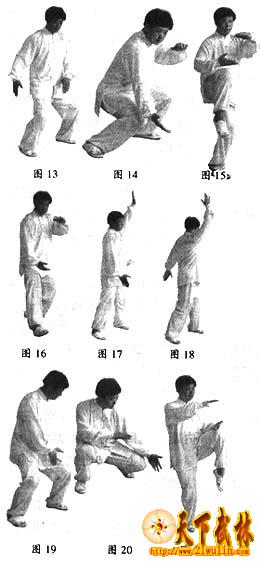 ②不停,右掌领臂往上朝右后划大圈,引身体上拔后即速下蹲成低马步,胯与膝平,同时,左掌变拳顺胸腹下滚,过裆变掌下插,掌心朝内,与体后右掌心虚虚相应相对(图12、 13)。