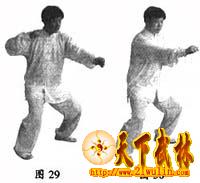 ⑤劲起右足。催劲过膝、胯、腰、背、肩、肘、腕,直达拳尖。右拳旋腕向前击出时,左拳内旋逆劲回拉于右肘窝内,两拳心皆朝下。击出之劲引领身法劲贯注于两前脚掌,足跟略提。劲走充足后即速正脊沉肩坠肘,足跟踩实,气劲归丹田 (图30)。 (待续)