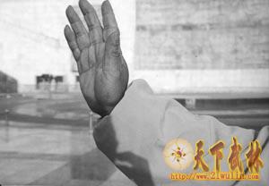 (2)侧掌 基本要领同上,惟中指尖略向侧后方。如单鞭,左掌中指略侧向右后方。
