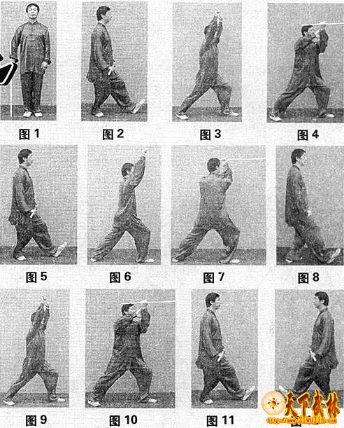 左脚向前方上一步成左弓步,同时两手握鞭上举,架于头上方,目视前上方(图9);上体右转,右手松开,左手持鞭臂外旋,使鞭在头上水平云转,以鞭把向前横击,右手扶在左腕内侧,目视鞭把(图10);重心后移成坐步,同时身体左转,右手接鞭下落于腹前,目视前方(图11)。