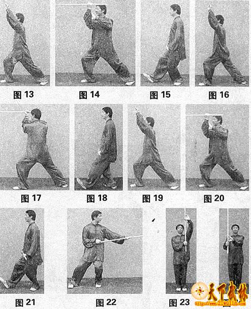 左脚内扣,随即重心移于左脚,身体右转成右虚步,鞭仍在腹前,目视前方(图12);右脚向前上一步成右弓步,同时两手握鞭上举,架于头上方,目视前上方(图13);上体左转,左手松开,右手持鞭臂外旋,使鞭在头上水平云转,以鞭梢向前横击,左手扶在右腕内侧,目视鞭把(图14);重心后移成坐步,同时身体右转,左手接鞭下落于腹前。目视前方(图15)。