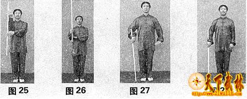 身体左转,鞭向左戳(图22)。左脚收并于右脚旁,两腿伸直,同时左手松握鞭上举,右手实握贴于左胸侧,目视前方(图23)。右手握鞭前伸,左手推在右手握鞭处上端,目视前方(图24)。右手松握鞭,在身体右侧向前舞鞭花,鞭梢端住地收式,目视前方(图25-28)。