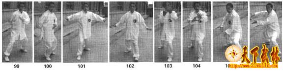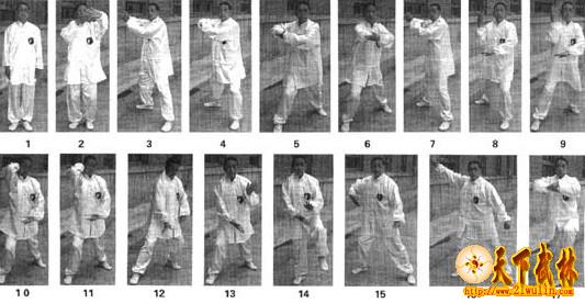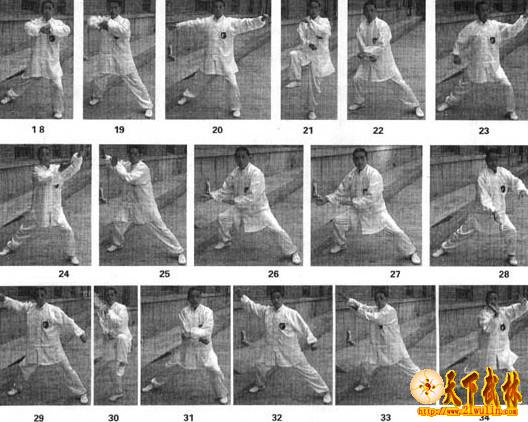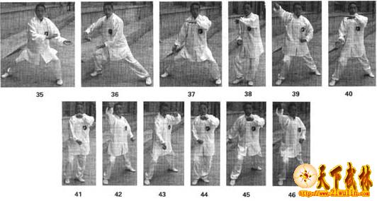 | 陈氏太极拳是各派太极拳的始源。它是由河南温县陈家沟太极拳鼻祖陈王廷所创,历经三百多年的传袭,昌盛不衰,并以其独特的技击与健身功能,广受中外人士青睐。太极拳流派甚多,就陈氏太极拳而言,也有好多套路,有新与老,大与小之分的拳势。随着时代的需求,大师们编了不少新的套路,其中四十二发劲是太极拳大师陈照奎所组编的。这套功夫架的特点为:动作技击明显,适用性强;刚柔相济转换快;圆方突变,慢走柔,快打刚。练此套路必须有一定太极功夫方可学练。 下面介绍四十二发劲拳势动作及练习要求,望太极拳爱好者共同研习之,从习练中更快理解太极之理,增强太极功夫。 第一势:腰拦肘 动作一(图1)立身中正,二目平视,唇轻闭,舌抵上颚,齿轻合,面南背北而站。 动作二(图2)身体缓缓下沉,腿微屈,气下沉,两臂上?,左手逆缠,右手顺缠,沉肩肘,手与眼平,眼视左手中指。 动作三(图3)接上势,重心先在左足,右脚脚跟抬起,划外弧向身后退步。身体向左转,躯干旋转带动手脚,左手顺缠,右手逆缠,双手高捋,重心移至右腿,上下相合,定势塌腰沉气,目视正南方。 动作四(图4)接上势,虚领顶劲,身体向左转,重心移至右腿,成弓步。同时上肢双手相合,如抱球状,左手在外,右手在里,手心相对。沉肩垂肘,含胸塌腰,目视前方。 动作五(图5)接上势,身体向左转。随体右脚外划弧45度上一步,成右虚步。同时,双手相合,互抓手腕,塌腰松胯,劲蓄右腹,意贯右肘,蓄劲待发,目视前方。 动作六(图6)接上势,重心前移至右腿,腰胯向左旋转,蹬左脚助力,弓右膝,沉肩发右肘劲。发劲时裆劲应扣合,意贯肘尖,目视肘前。 第二势:上挑肘 动作一(图7)接上势,身体向右旋转,右脚随体而转,外划弧后退;同时,双手变高捋;前用捋手,后退打背靠。走柔劲,蓄劲待发,目视前方。 动作二(图8)接上势,身体左转,重心移至左腿,由捋势变为右手外划弧顺缠,左手逆缠下划弧落到胸前。虚领顶劲,沉肩垂肘,塌腰落胯,劲蓄右侧,目视前方。 动作三(图9)接上势,重心移至左脚,身体左转。右脚上大步,向前45度落脚,成为右虚步。同时,右手指领劲向耳后穿,左手在右肘下微下按。塌腰松胯,劲蓄右侧,意在肘尖,目视前方。 动作四(图10)接上势,身体迅疾左转,左脚蹬地助力,前弓右膝。同时,右手快速逆缠,向右耳后猛穿,右肘挑打,左手下捋采,上下、内外要相互组合,意贯肘尖,目视前方。 第三势:摘星掌 动作一(图11)接上势,重心不变,右脚踏实扎根。沉肩垂肘,塌腰松胯。右肘要与右膝相合。意在右肘下护胁,蓄动待发,目视前方。 动作二(图12)接上势,重心后移至左脚,身体左转,随塌腰转体,右肘下挂摔掌;同时,双手手心朝下,捋抓猛摔。沉肩松胯相互配合,下肢裆劲合扣,目视右手。 动作三(图13)接上势,重心前移,转换腰胯,体向右转,成右弓步。随转体两手变劲,左手顺缠划弧变前推,右手顺缠变手心朝上,与左手相合,目视前方。 动作四(图14)接上势,重心完全移至右足,屈膝生根,提左膝上顶。同时,上肢双手紧合。含胸塌腰,蓄劲待发,目视前方。 动作五(图15)接上势,左脚踹蹬,重心在右,成左虚步。同时,双手如搓球状,左手逆缠下采,右手逆缠上提,肩沉打肘劲。上下配合,迅速刚发,目视右手。 第四势:穿心肘 动作一(图16)接上势,重心不变。双手握拳逆缠,右手走上弧,左手划下弧,双拳同开。沉肩,塌腰,气沉丹田,目视前方。 动作二(图17)接上势,重心完全放在右足,要扎根站稳。提左脚,膝盖上顶里合,双手顺缠划弧相合于胸前,双手变掌相互抓握于手腕,左手在里,右手在外,目视前方。 动作三(图18)震左脚,同时出右脚,向右侧横跨大步。含胸塌腰,身体微向左转,蓄劲待发,目视右肘。 动力四(图19)接上势,上下相合,身体快速向右侧旋转,蹬左足助力。重心移至右腿,上肢肘尖领劲,左手推送助力,意贯右肘尖,迅发刚劲。 第五势:左背靠 动作一(图20)接上势,重心移至左腿,双手逆缠同开。虚领顶劲,开胸,开裆,塌腰松胯,气沉丹田,目视前方。 动作二(图21)重心完全移至左腿,左足生根成轴心,提右腿,膝盖领劲上顶并里扣,双手顺缠里合在胸前停,左上右下,如抱球状。虚领顶劲,沉肩含胸,塌腰松胯,劲蓄左侧,目视前方。 动作三(图22)接上势,震右脚,重心下沉。同时,开左脚向左侧横跨一大步,双手相合成十字,落于腹前。塌腰松胯,蓄劲于右侧,意贯左肩背,蓄劲待发,目视前方。 动作四(图23)重心快速移至左脚,蹬右脚助力,身体向左侧旋转。双手握拳同开,左拳顺缠外?,右拳逆缠向身后猛击。劲由左后背发出,内外相合,发劲应速,目视前方。 第六势:左? 动作一(图24)接上势,重心不变,身体向左侧微转,松左胯;右手由下划弧顺缠向左?接,与左肩平,手心朝上。虚领顶劲,塌腰松胯,目视前方。 动作二(图25)重心移至右,身体向右旋转。上肢随体变高捋,含胸塌腰;下肢裆应合扣,目视前方。 动作三(图26)重心在右腿,放稳踏实。随塌腰松胯,双手由上向下划弧采按。沉肩垂肘,目视前方。 动作四(图27)重心不变,右手顺缠变手心朝上,与左手照应。腰裆劲要转换过,劲蓄右胯根,意贯掌侧,裆部应圆扣,蓄劲待发。 动作五(图28)重心快速移至左腿,蹬右脚催力,身体向左侧旋转;双手随身体而转,沉肩肘,打?发劲。两手如抱球状,左、右手劲贯小指外侧,目视左手。 第七势:右背靠 动作一(图29)接上势,重心移至右腿,身体向右旋转。双手握拳同开,右上左下划大圆,沉肩开胸,塌腰落胯,气沉丹