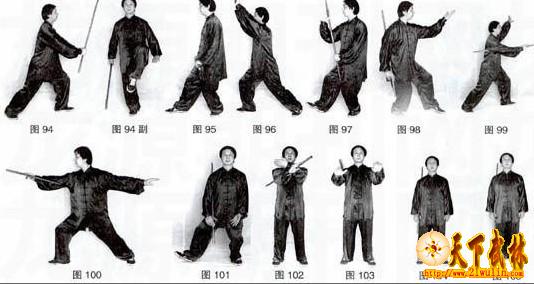 要领:翻鞭时鞭走立园,上步要轻灵、稳定,松腰收胯,松肩沉肘。 2、右弓步右拨:右脚向前一步,脚跟先着地,随即重心前移成右弓步,同时右手持鞭把段由左后向右前横拨,高与肩平,左手跟于右腋下,目视前方。(图85) 左势: 与右式相同,唯左右互换。(图86、87) 第三段 (十七)虚步扣鞭(海底针) 1、左步翻鞭:重心后移于右腿成左虚步,同时腰向右转,带动左手持鞭梢段向体右侧下挂,再翻于体前,右手握鞭把段帖于右腰侧。目视前方。(图88) 要领:挂鞭要走立圆,挂鞭与翻鞭要连贯,不可中断,身体中正安舒。 2、左虚步扣鞭:上动不停,鞭略向后伸,随即右手持鞭把段由后向前翻扣于左小腿前内侧,左手松握鞭,收于右腋下,目视前下方。(图89) 要领:松腰收胯,背成弧形,松肩垂肘,周身要得力。 (十八)左弓步推鞭 左脚略向前进步,脚跟先着地,随即重心前移成左弓步,同时两手翻转,使鞭顺时针向后旋转,左手向前上方推鞭梢段,高与眼平,右手握鞭举于头右侧。目视前方。(图90) 要领:鞭成水平,两臂成弧形,身体正直。 (十九)独立提鞭 1、右转身:重心先移于右腿,随即左脚内扣,身体右转重心移于左腿成左虚步,同时鞭随身顺时针转于体前,目视前方。(图91) 2、撤步右独立右手提鞭:上动不停,右脚后撤一步,左腿屈膝提起成右独立步,同时鞭继续顺时针旋转,经右臂外侧转至鞭梢斜向下。目视前方。(图92、93) 要领:上述动作要连贯、圆活,鞭走立圆,独立要中正稳定。 (二十)弓步崩鞭 左脚下落成左弓步,同时右手持鞭把段向前崩起,左手护在右腕上,鞭梢高与头平。目视前方。(图94) 要领:崩鞭要坐腕发出快速的弹崩劲,两臂成弧形,松肩沉肘。 (二十一)弓步上架 1、右转身:重心后移于右腿,左脚尖内扣,身体右转,同时右手抽鞭,左手滑握于鞭梢段,使鞭横帖于小腹,重心后坐于左腿,目视前方。(图95) 2、右弓步架鞭:上动不停,右脚尖外摆,重心右移成右弓步,同时两手举鞭上架。目视前方。(图96) 要领:从左向右移重心与举鞭上架,动作要流畅、平稳,两臂成弧形,鞭成水平。 (二十二)弓步架戳 1、左转身穿掌:重心后移于左腿成坐步,同时左手持鞭梢段下落于腹前,右手松握把段在头前,使鞭直立于身前。目视前方。(图97) 2、左弓步架戳:右脚尖内扣,身体左转,重心移于右腿成左虚步,同时左手握鞭梢段收于右腋下,右手略向前推鞭把段(图98);随即左脚略向前,脚跟着地,同时左手向前上方穿架,右手持鞭下落帖于右腰侧;重心前移成左弓步,同时左手臂向左上方翻架,右手持鞭把段向前平戳。目视前方。(图99) 要领:上述动作连贯不停,穿掌时手臂要外旋掩肘,动作要舒展大方,左臂架掌不可伸直,两肩力求平正。 (二十三)十字手 1、展开两臂:左脚尖内扣,右脚尖外摆,重心移向右腿,同时右手持鞭水平向右横摆,高于肩平,左手下落,手心向下与肩平。目视鞭把。(图100) 2、坐步收鞭:重心移于左腿成坐步,同时两手落于腹前,右手持鞭把段,梢段帖于右肩后。目视右前方。(图101) 3、开立步十字手:右脚尖内扣,随即脚跟提起,两手在腹前交叉,左手在外。接着重心移于两腿中间,身体舒直,两手保持交叉向上提至胸前,左手在上,右手松握鞭,鞭梢段在右腋下,目视前方。(图102) (二十四)收式 1、两手臂分开:步型不变,两手臂分开与肩同宽,两手心均转向下。目视前方。(图103) 2、两手臂下落:步型不变,两手臂松落于身体两侧,右手持鞭把段,梢段帖于右肩后,目视前方。(图104) 3、还原:左脚收并于右脚旁,还原为同预备式姿势。(图105) 注: 1、太极鞭杆的健身效果与太极拳相同,但是太极鞭杆更具有优越性。 2、两手持鞭,对身体锻炼更加全面。 3、趣味性强,易于引起练习者的兴趣。 4、是中老年人的良好伴侣,可以为手杖,保护身体平衡,不致跌倒受伤。 5、易于制作、携带,价格底,可以代替刀剑运动。
