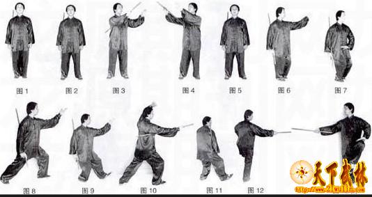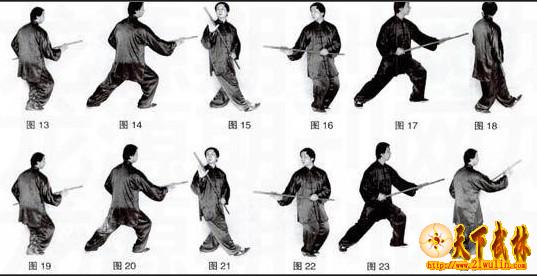 要领:左手要成园弧形,两肩要平,戳鞭力达把端。 (三)独立抡劈 1、左坐步落鞭:重心后移于左腿,右脚尖翘起成坐步,同时右手持鞭把段放松下落于裆前,左手下落于右肩前。目视前方。(图11) 要领:落鞭有下挂之意,两肩要松垂。 2、右独立轮劈:左脚尖外摆,重心前移,随即右脚向前一步,左腿提起,脚尖下垂成右独立步,同时右手持鞭轮劈,高与肩平,使鞭梢在身体左侧向前划立圆,左手按于左膝上。目视前方。(图12) 要领:独立要平衡稳定,独立腿可以稍屈。鞭成水平。 (四)左右戳鞭 右式: 1、右丁步持鞭:左脚落于右脚旁,成虚点步,同时,右手持鞭收于身体左侧,左手接鞭,握鞭梢段。目视前方。(图13) 2 右弓步戳:右脚向前一步脚跟着地,随即重心前移成右弓步,两手持鞭前戳,右手在前半握鞭,左手握鞭紧帖左腰侧。目视前方。(图14) 左式: 1左丁步持鞭:重心后移右脚尖翘起,成左坐步,同时上体略右转,右手持鞭向右上方摆起,目视鞭把段;随即左脚上步收于右脚内侧,脚掌着地成丁步,右手向后松落,鞭杆成水平帖于体右侧。目视前方。(图15、16) 2左弓步戳:左脚向前一步脚跟着地,随即重心前移成左弓步,两手持鞭前戳,左手在前半握鞭,右手握鞭紧帖右腰侧。目视前方。(图17) 右式:与前左式相同,唯左右互换。(图18、19、20) 左式:同前左式。(图21、22、23) 要领:上步成丁步时,目随视鞭,使鞭身协调,动作顺畅戳鞭时两手协同用力,松肩垂肘,力达鞭端。 (五)虚步抱鞭(手挥琵琶) 1、跟步右横击:右脚跟进半步,重心在左脚,同时,腰略向左转,右手持鞭把段,向前横击,高与眼平,目视前方。(图24) 要领:跟步的同时鞭横击,横击时重心略下沉,松肩沉肘,鞭有裹劲。 2、左虚步抱鞭:重心后移于右腿成右坐步,同时腰向右转,右手持鞭把段收于腰右侧,左手持鞭梢段向里回裹,高与眼平,目视前方。(图25) 要领:坐步的同时鞭向回裹带,鞭裹于身体中线部位,头正身直,松腰收胯。 (六)退步劈鞭(倒卷肱)