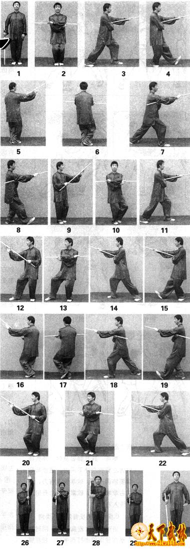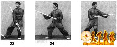 8、收式:重心后移成坐步,同时右手握鞭把,在身体前下挂,随即成右弓步,右手握鞭前劈(图23、24)。身体向左转,鞭杆左戳,右手变正握把段,目视前方(图25)。左脚收并于右脚旁,两腿伸直,同时左手松握鞭上举,右手实握贴于左胸侧,目视前方(图26)。右手握鞭前伸,左手推在右手握鞭处上端,目视前方(图27)。右手松握鞭,在身体右侧向前舞鞭花,鞭梢端住地收式,目视前方(图28、29、30)。