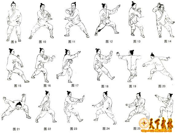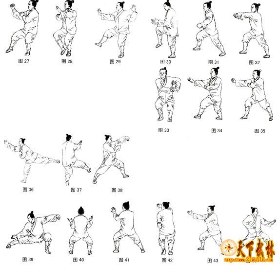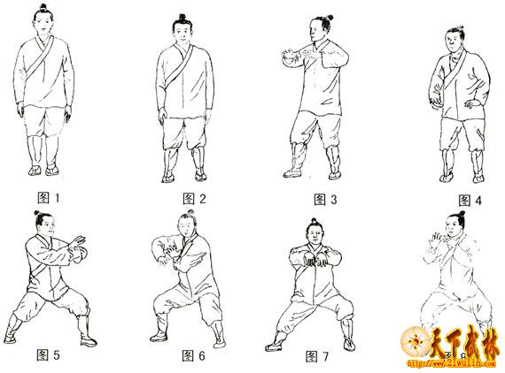 (二)连贯一气,从“起式”到“收式”,动作衔接紧密,没有明显的停顿。但速度却有快陧节奏,用劲有刚有柔,步法有跳跃、摆旋,类似陈式“老架”。