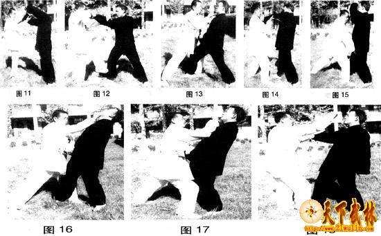 若乙方出右步打右拳时,甲方趁机用右手抓握乙方手腕高引捋,重心快速移至左腿,内气下降站稳扎根。随即提右脚,用脚尖领劲直接踢击乙方右前腿的臁骨处;落脚贯劲跺击乙方右脚指,上下配合。然后,上左步套腿,上肢捆绑推击发劲,将乙方击倒。