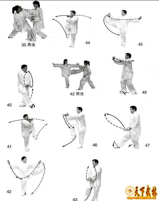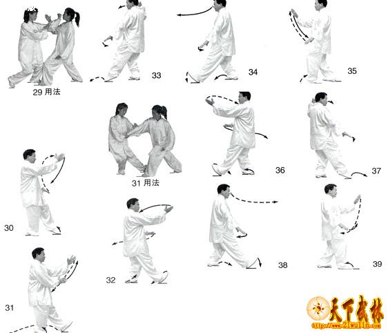 【动作要求】身体转动以腰为轴,胸部宽松舒展。手臂运行要保持弧形,肩肘要松沉。