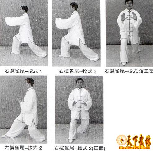 接下去再看再练。“手弓”连接手臂结构,串联肩关节、上臂肱骨、肘关节、前臂尺骨和桡骨、腕关节、手掌与手指,左 右手相连,又成一大“手弓”,弓把的部位在夹脊。“手弓”的重点在沉肩坠肘、气能通臂,还得注意肘心与掌心的同一方向。然后是“足弓”连接腿部结构,将髋 关节、上腿股骨、膝关节、小腿胫骨和腓骨、踝关节、脚掌与脚趾连为一体,而左右腿相连,又成一大“足弓”,弓把的部位在尾闾(脊椎骨下部末端的最后四节骨 椎)。“足弓”的重点在圆裆松胯,膝盖的方向与脚尖方向相同(膝盖对脚尖),步法轻提轻放,只有这样才能迈步如猫行。最后是“身弓”,连接头顶后上方的百 会穴与身体下方的会阴穴(海底),背要拔,脊要竖,上下垂直连成一线,上面是虚灵顶劲,下面是气沉丹田。“身弓”的重点是松命门,腰要向背后放松,只有这 样才能气通身后的尾闾、夹脊、玉枕三关。