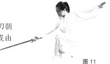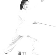 (1)左胯松沉,重心移至左腿成左弓步,同时右手握剑掌心朝上向左抹剑。(图11)