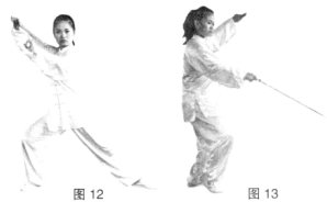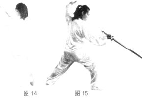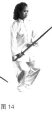 平剑,剑尖由左向右划一小立圆为绞,力达剑身前端。(图13、14)