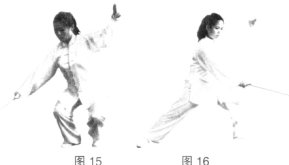 (2)上动不停,右胯松沉,右脚向右上步成右弓步,同时右手握剑掌心朝外,顺肩方向向右刺出,左手剑指向上架于身体左上方。(图15)