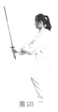 立剑,沉腕使剑尖猛向前上为崩,力达剑身前端和剑尖。(图19、20)