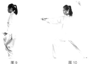 注意:上步时步伐连贯一气呵成,步要轻灵,身体中正。