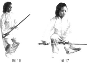 平剑,向左或向右横击,力达剑身,剑与地面平行,扫剑在膝盖以下,主要攻击对方踝关节和小腿部位。(图15、16)