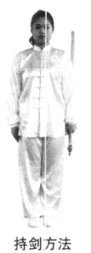 持剑常见于套路的起势与收势,左手持剑剑尖朝上,掌心贴护手,食指附于剑柄,其余四指扣住护手。如图示。