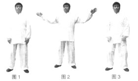 (2)两手匀速向上抬起从外向里划弧,两手高不过眉,合于身体中线处左手在前、右手在后,继续划弧下落至原位;同时两腿要转换虚实,两手上抬时重心在左腿,下落时重心在右腿。(图2、3)