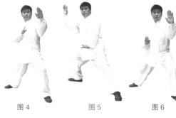 (2)上动不停,右胯松沉,重心移至右腿成右弓步;同时右手掌心朝外顺势向右后划弧、左手顺势向右向下划弧。(图5)