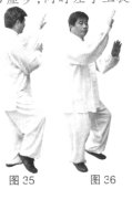 (1)左胯松沉,身体微左转,左脚经右脚向左后撤步,右脚跟步成左实右虚步:同时左手上提两手顺势向左向下向后划弧,左手在外右手在里放于身体左侧。(图35)