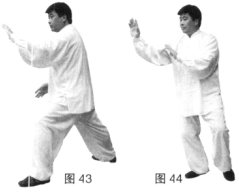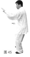 (4)上动不停,左胯松沉,左脚脚尖外摆,右脚经左脚向左上步,左脚跟步成右实左虚步;同时两手顺势向后向上再向左划弧,左手掌心朝下放于胸前,右手掌心斜向下放于体前。(图44)