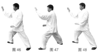 (1)左胯松沉,身体微左转,右脚向前上步成右弓步;同时右手向前划弧上掤,左手向左后划弧放于小腹前。(图46)