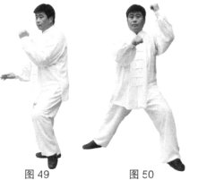 左胯松沉,身体微左转,左脚经右脚向前上步成左弓步;同时左掌变拳上领向左划弧架于体前,右手收至腰间变拳,立拳向前打出。(图49、50)