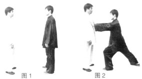 (2)乙左弓步推掌,双手攻击甲胸部。(图2)