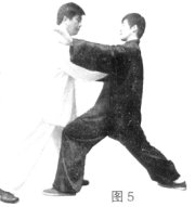(4)顺势进步进身,以双手击乙方胸部。(图5)