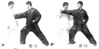 (3)甲沉腰松胯侧身上步化解乙掌劲,身处乙手臂外侧,同时两手划弧上掤接住乙手臂,前掌上托乙大臂根部,后手缠拿乙手腕。(图13)