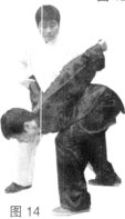 (4)松胯转腰双手形成合力,顺势将乙手臂向甲侧后下方引带。(图14)
