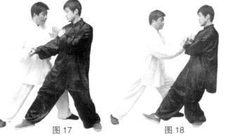 (4)如乙回撤,甲顺势松肩沉肘变按掌,向前将对方按出。(图17、18)