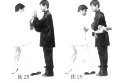 (3)上动不停,右胯松沉,身体右转,右脚落地,右脚脚尖右摆,左脚过右脚向右前上步,右脚跟步成左实右虚步;同时两掌变拳逆时针划一立圆至身体左侧,拳与胸同高,左前右后,两拳拳眼相对(图26、27)