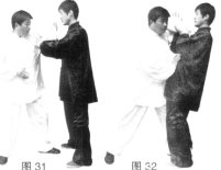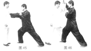 (3)甲身体下沉上左步,左手经胸前划弧上拥乙手臂、(图46)