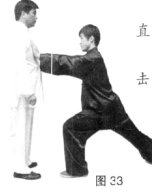 (2)上动不停,左脚经右脚向左后撤步成右弓步;同时右手顺势向右后划弧至身体右侧,左手顺势向左后划一立圆落于胸前(注意:左手下按与右脚撤步同时走)。(图33)