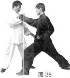 (2)乙上步冲拳,攻击甲胸部,甲右手接乙右手。(图36)